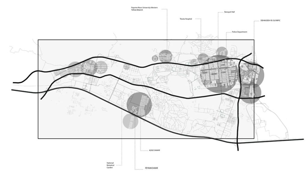 District 22 is located between Tehran and Karaj, with the nature of being objective. In a larger scale, it can be considered as an object that has been attached to Tehran. In a smaller scale, it contains different objects that emphasize their significant presence. The influence of this district on big cities like Tehran insists on this nature, but on a smaller scale, it contains isolated packages that are separated to a wide level. The existence of height contrast also adds to its objective nature. In this district, we encounter two city flows: one that happens on the ground, like Tehran, and another that occurs at different height levels. The city flow in Tehran is defined by conjunctions and the relationship between its components, while the plugged district is defined by pointed flows and the isolation of significant packages and their inner relation. Here, the ground is generated in height, and horizontal levels are meant to be important. In this district, spots with different programs, like isolated packages, are formed with their specific colonies. Little or big spots with different programs, although from the aspect of relation and function, they are weak, but they have the potential to improve. Being near highways, being a colony, and being a threat in the current condition may also be considered an opportunity. The existence of highways near spots with different programs, because of its high acceleration, has an influence on active neighbors. Decreasing the distances and their repulsion are their potentials. One active body, like Azadi Stadium and Chitgar Park near Tehran-Karaj Highway, and from the other active side of the Hemmat Highway, has similar conditions. Highways, as an object in Tehran, break down the field of the city at their crossings, and in district 22, they go from the neighborhood of a large number of objects. Before entering District 22, we face the city as a field, but after entering, we face the city as objects.