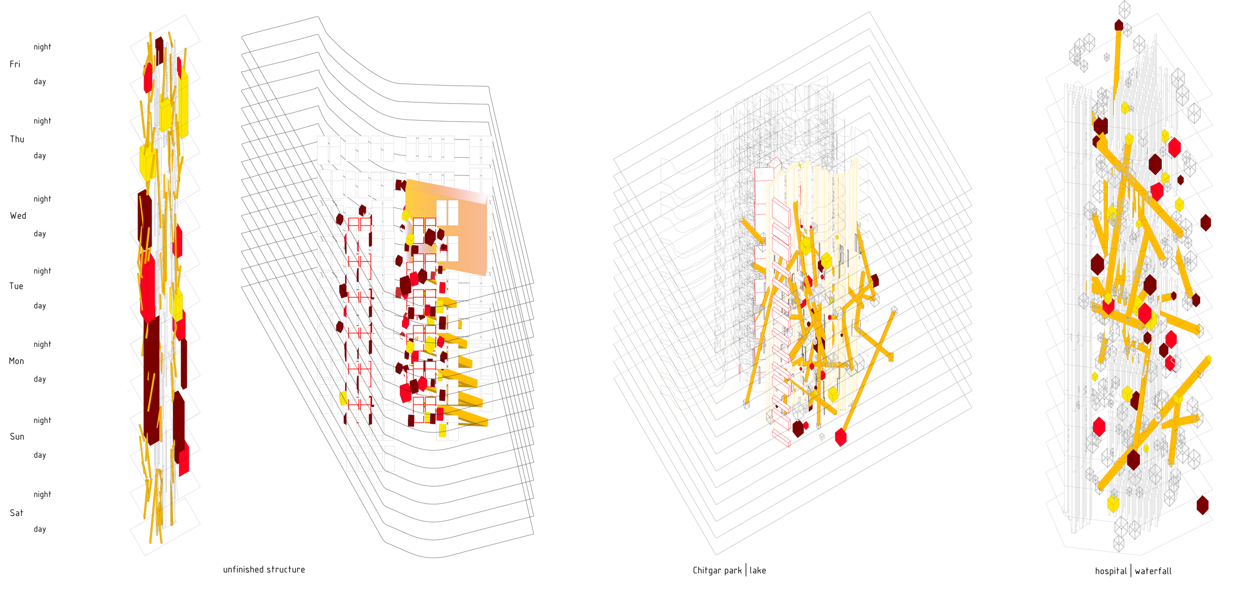 These diagrams are designed to analyze the activation times of programs. The X and Y axes represent the building plan, while Z represents the active time of the building. This diagram can assist us in designing the space between two programs, converting the “between space” into a program with 24-hour availability.