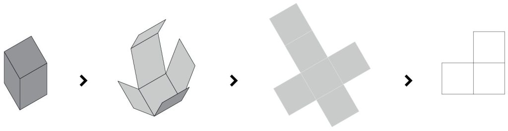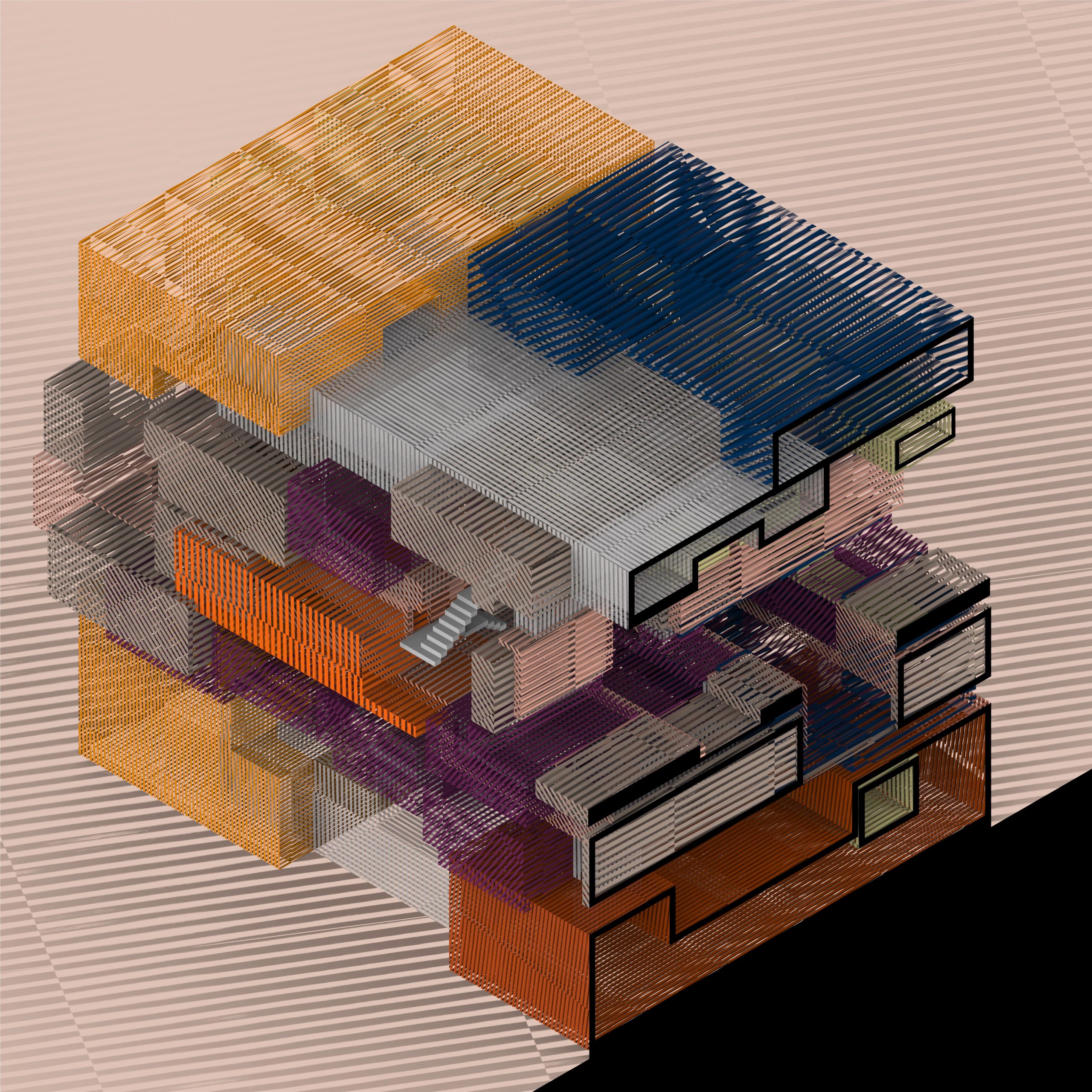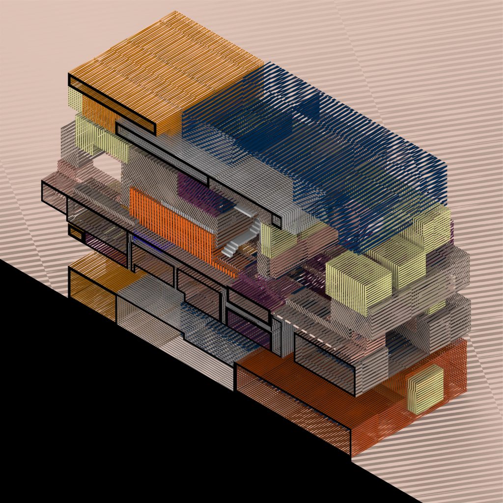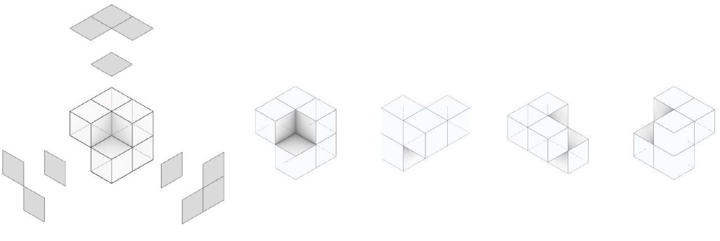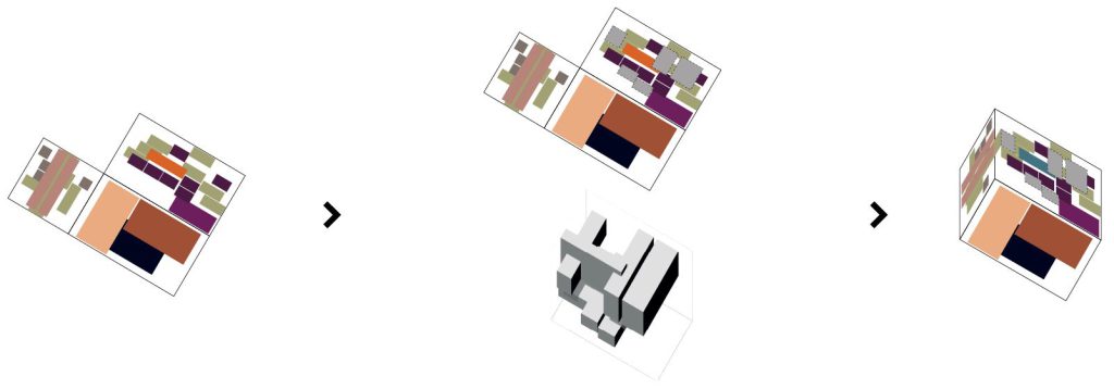 Cubic objects can be recognised from 3 sides otherwise you can realize them from three sides to know the volume. Although sides must be perpendicular. Actually this volumes can be recognised with sides of their bounding box. This project works with this sides. At the first we consider a 3d area of the project at its most dense condition; cube and draw it’s unroll form. Therefore six side of cube, two by two, show same sections of one volume we omit one of them and at the end we reach to three rectangles or squares that have been put together as their unroll condition. These three surfaces are our main base of design that not only create our form but arrange our physical programme. The project is educational and it has been divided from functions of private and public to three groups and each of these groups has been put at one of three unrolled surfaces. In closer view each of these sections have their own priority. It means that when they have been extruded they may have collision with other one of two sections and these priorities choose that which of this extruded volumes should be remain and which must be omitted. At the end system as a circulation and public spaces are added that has highest priority and remove every collision and be removed at the end.