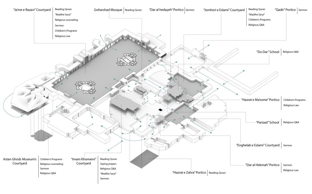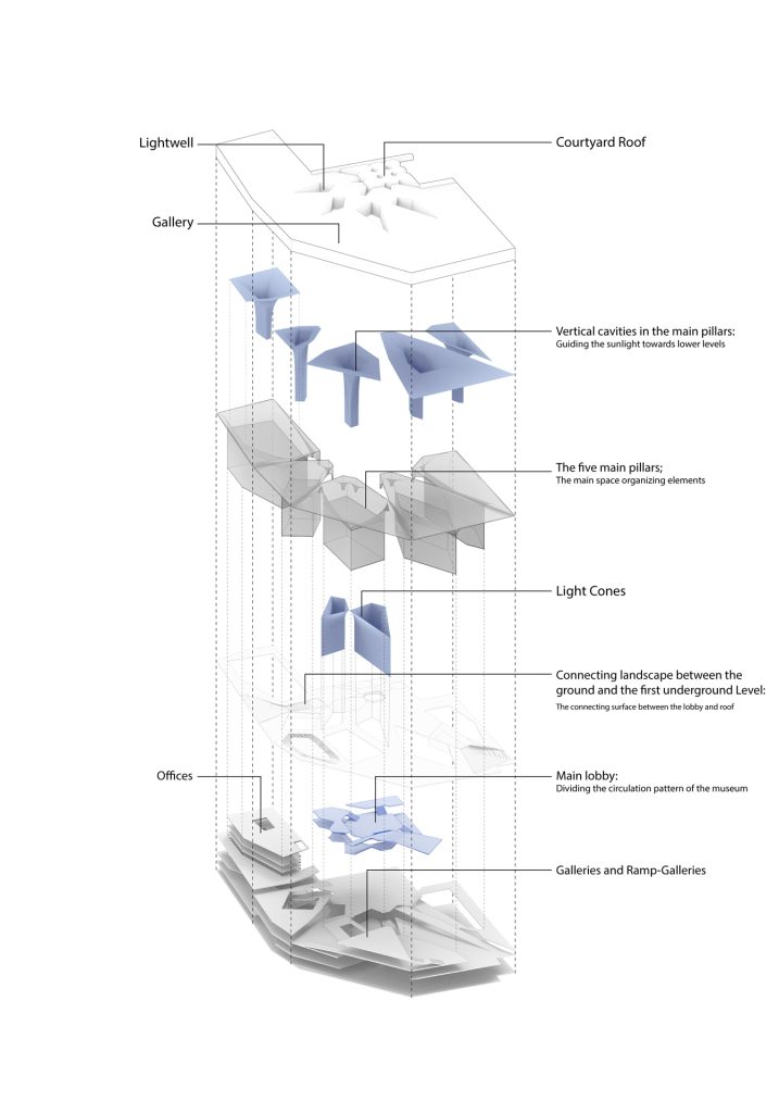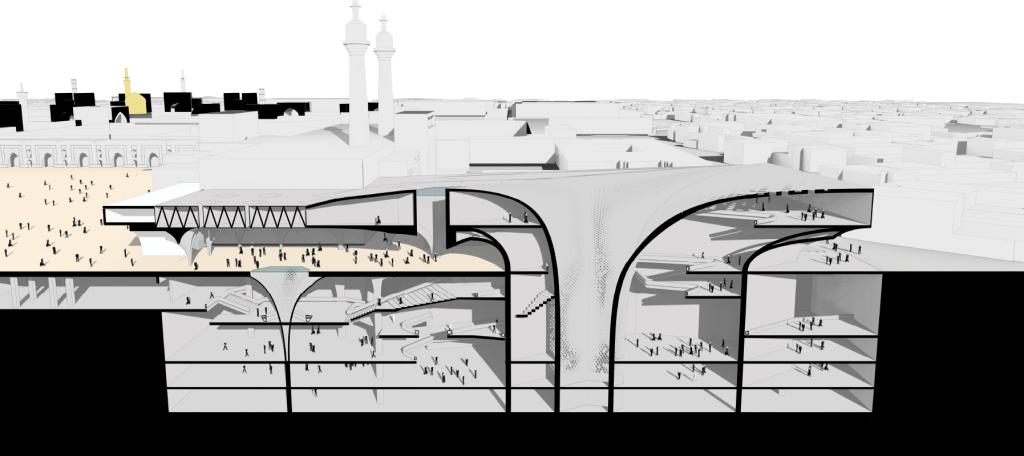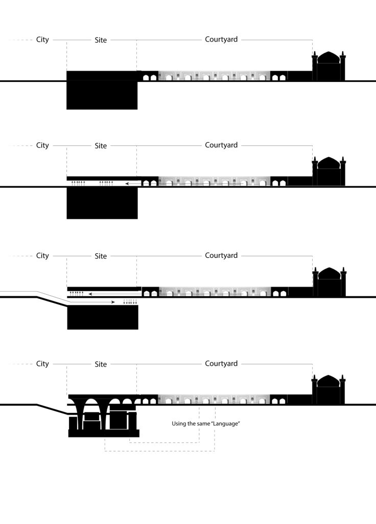 The propsed museum follows the “structure” as the rest of the complex: courtyards (“Sahns”) make up the majority of the shrine, in which different programs take place (religious activites, education and etc. ). Thus a roofed courtyard was designed at the ground level to both act as an event space and to connect the museum directly to the shrine. Thus museum spaces are situated in the underground levels and one level above ground.