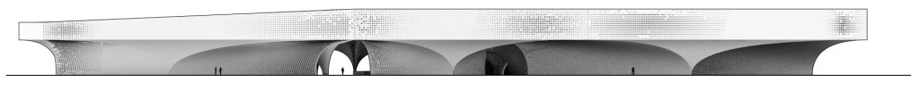 Five enormous pillars were erected to act as space organizers and support the above ground level, in which gallery spaces are situated in and between this pillars, resulting in two circulation paths being formed around the pillars.