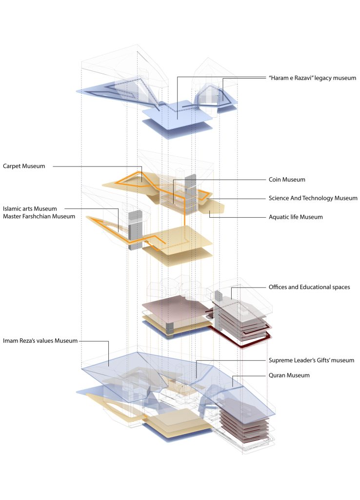 Imam Reza’s shrine in Mashhad, Iran, is considered one of the most visted holy sites in the whole muslim world. With this large number of pilgrims, comes a large wave of offerings and tributes to the holy shrine, which would be placed within the existing museum in the complex. The exisitng “museum” acts more as a storage rather than a museum, with a low visiting rate from the pilgrims. Thus a competition to erect a new museum, alongside the outer border of the complex in a much bigger land was commenced, with the goals of bringing in more population flow into the complex and the museum.