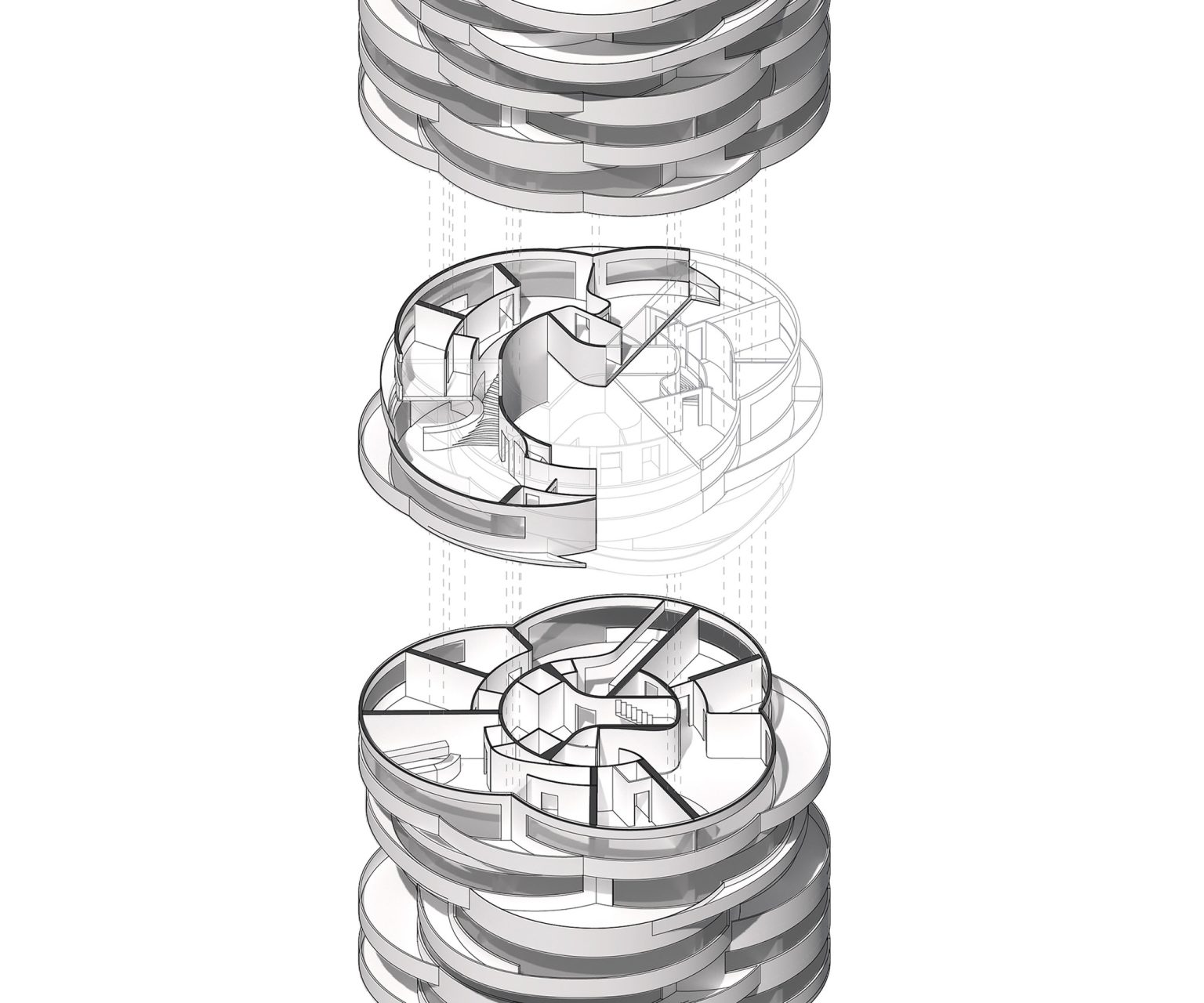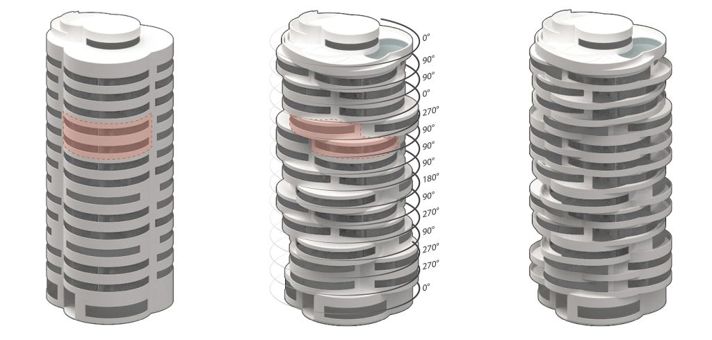 The interlocking of maisonette apartments was a core design concept by MARZ for achieving the widest visual range in the Namak-Abrud residential tower. This rotating tower is situated in the verdant strip on the northern side of the Alborz Mountains, where the foothills are