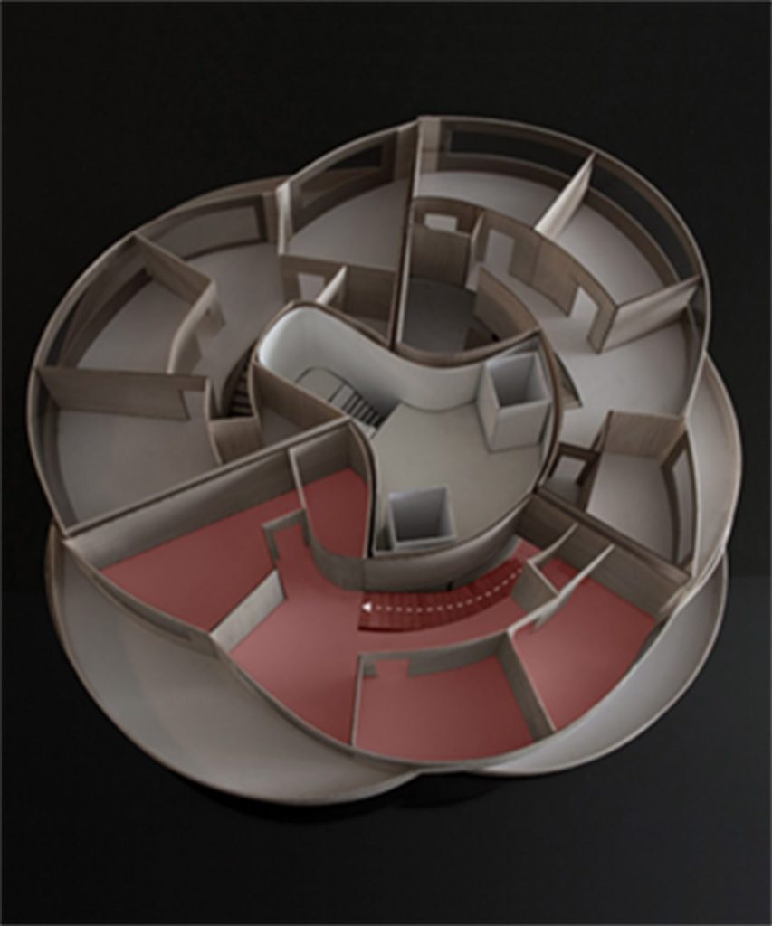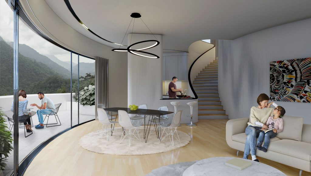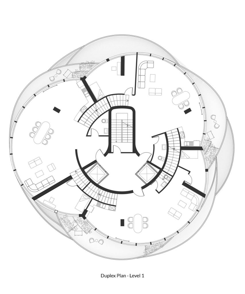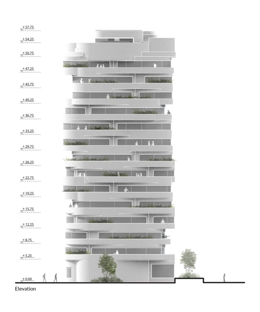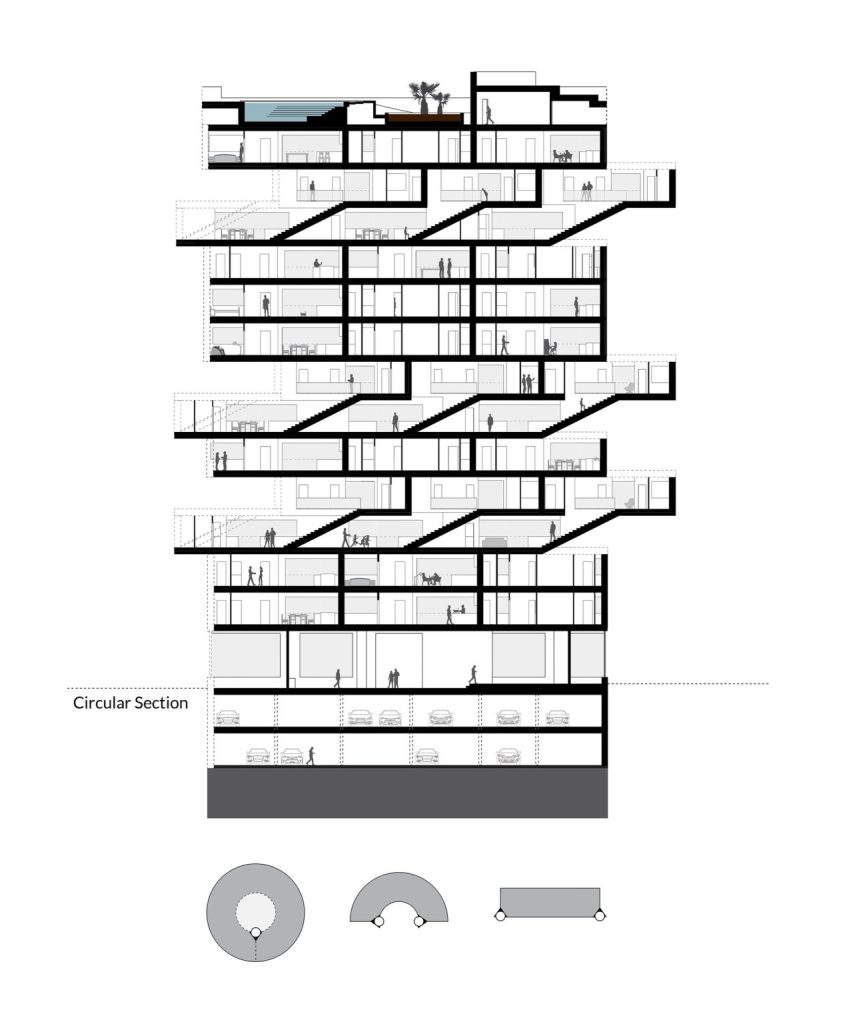 closest to the sea. Interlocking floors in residential towers is not a novel concept; it was famously utilized by Le Corbusier in his Unité d’Habitation project to minimize corridors and enhance cross-ventilation, and by Charles Correa in the Kanchenjunga building to shield interiors from harsh light and monsoon rains while leveraging sea views and breezes. In this context, MARZ employs this methodology to optimize panoramic vistas in the Namak-Abrud Tower.