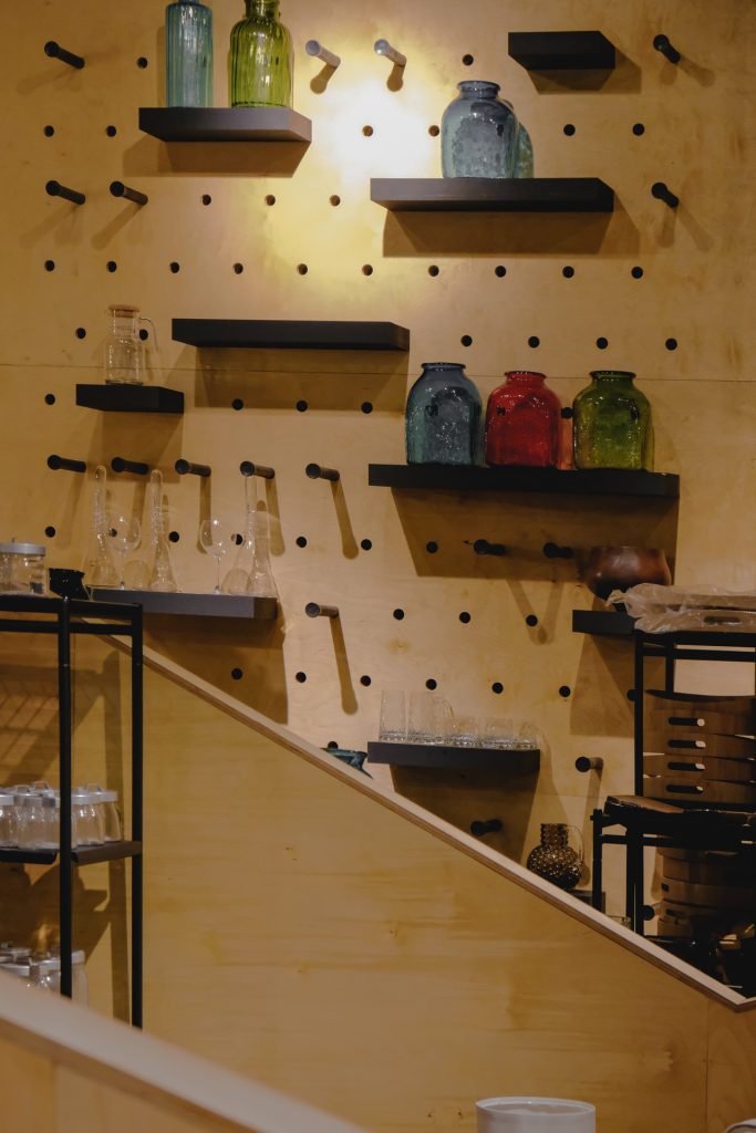 The interior space of Rast Home Store is hosting a set of objects contrary to the inexact geometry of the interior space which is influenced by the strong geometric forces of Ava Center. This family of objects is autonomously designed and placed inside. From an L-shaped shelving unit in the corner to a flat rectangular pegboard on the wall to a large sphere hanging in the air: the scene is arranged by an array of functional and non-functional objects. Despite the formal autonomy of the objects what binds them all together is their common syntactical quality. Plywood sheets (as surfaces), steel rods (as lines), and nuts and bolts (as points) are the materials of this syntax.