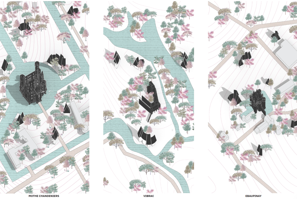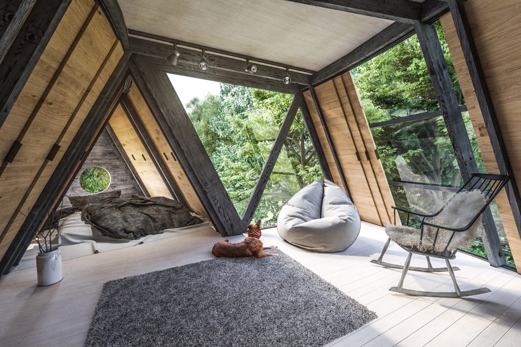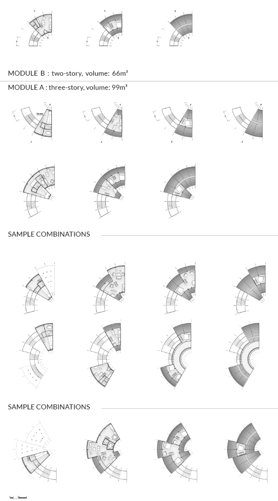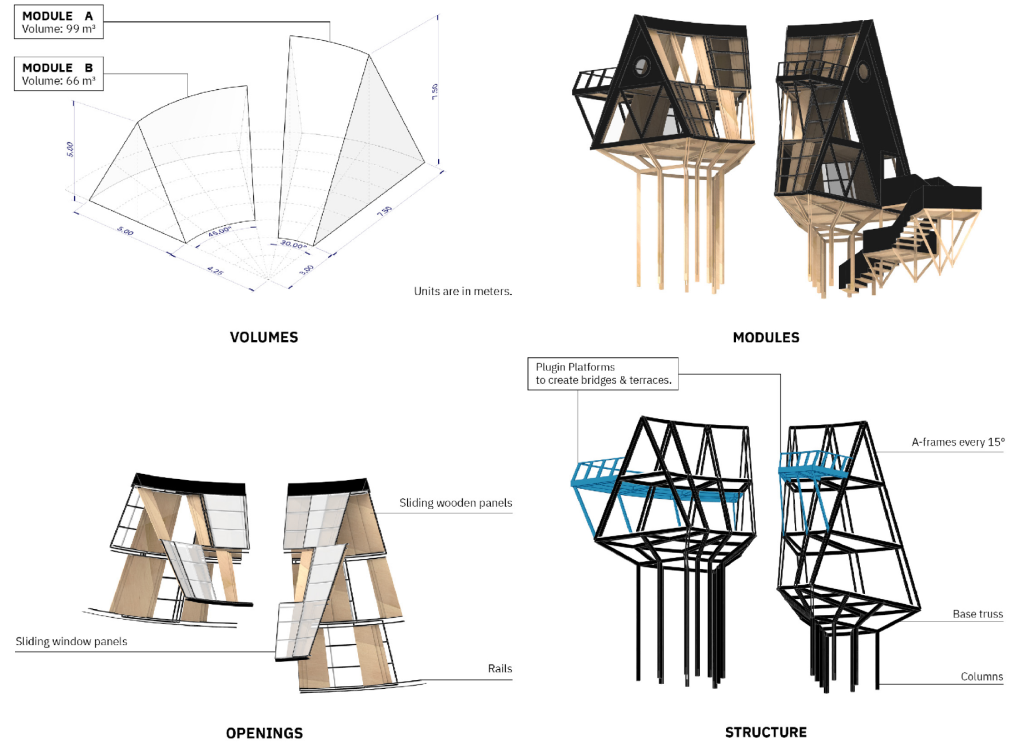 Being elevated from the ground and among the branches is the key to the unique atmosphere of tree-houses. Instead of sticking to the structure of a tree, we suggest to revolve around it and consider it as the pivotal axis of our design. Different spaces are organized in multiple slices and levels and the arc shape of the modules creates the ability to maneuver in the woods with different combinations and generate small elevated neighborhoods through the natural context. The façade system consists of two separate layers of shader panels and glass window panels which can slide on the conic surfaces of the modules, therefore, provide the ability to adjust the light, privacy, and openness at every space independently.