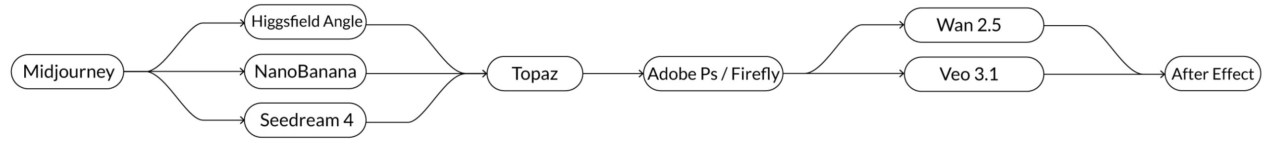 One of the core challenges in Marble was maintaining a strong sense of character consistency across all visuals. The campaign began by designing the ideal character using Midjourney, focusing on defining their unique aesthetic, mood, and personality. Once the visual identity was established, I developed a custom pipeline combining Nanno Banana, Seedream, and Higgsfield Angle to recreate the same character from multiple perspectives and lighting conditions.