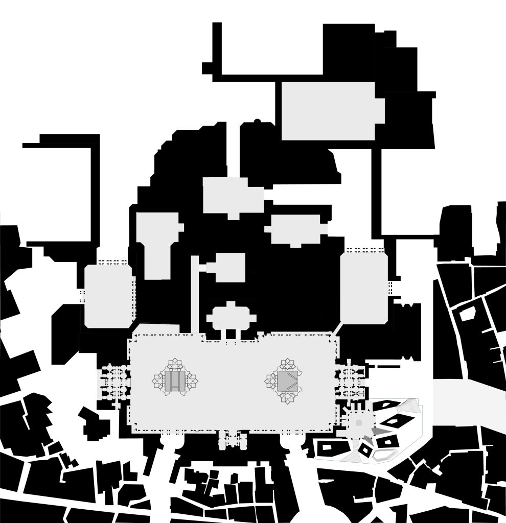 The propsed museum follows the “structure” as the rest of the complex: courtyards (“Sahns”) make up the majority of the shrine, in which different programs take place (religious activites, education and etc. ). Thus a roofed courtyard was designed at the ground level to both act as an event space and to connect the museum directly to the shrine. Thus museum spaces are situated in the underground levels and one level above ground.